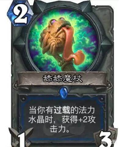 鱼人萨重要的解场和输出手段,我们可以看到过载的机会是很多的,吞食者、流电爆裂、熔岩爆裂等等都有过载的效果,那么2费13作为补刀武器不亏,如果2费能打出3攻3耐久就非常赚了。主流的节奏贼很多3血随从,是比较关键的武器