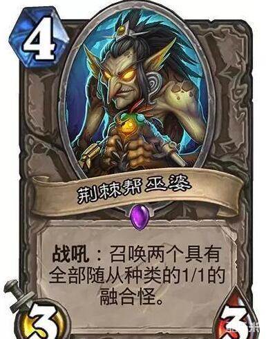 荆棘帮巫婆本身质量就很高了,4费一个33两个11在攻击频率和身材上都已经超模。我们带巫婆还有一个好处是战吼的两个融合怪也能算鱼人,那么配合招潮者、领军等等都是有BUFF效果的,在卡组的容错率很高!