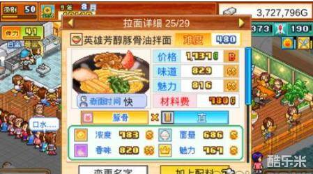 往下拉菜单,还可以看到面条的数值,以及汤底的数值。这每一个数值大多数都是越高越好的,例如面量影响一个客户是否能吃饱,香味影响客户排队,材料费影响你的收入(越低越好),价格不能超过客户消费水平,味道之类的影响评分,注意以上这些都可以通过道具来进行后期纠正,要利用好道具。