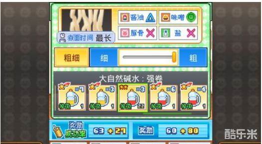 好的碱水,同样也是风味跟口感加的多,额外奖励加的多的,而碱水还分卷度,例如你需要制作强卷的拉面,那么你必须需要强卷属性的碱水;