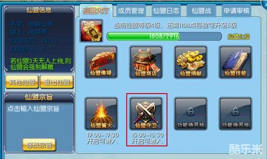 2、仙盟守卫开启时间为每日15:00-15:30。