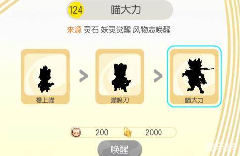 这二位都是金属性妖灵。喵大力可以通过花费200喵呜符印+2000灵石的代价进行唤醒,但是考虑到这种代价太过高昂,并不推荐。另一种就是看"欧气"的灵石唤醒模式。最后当然也可以选择最笨但也最有效的妖灵唤醒,从檐上喵到喵呜刀再到喵大力一步步培养而来。