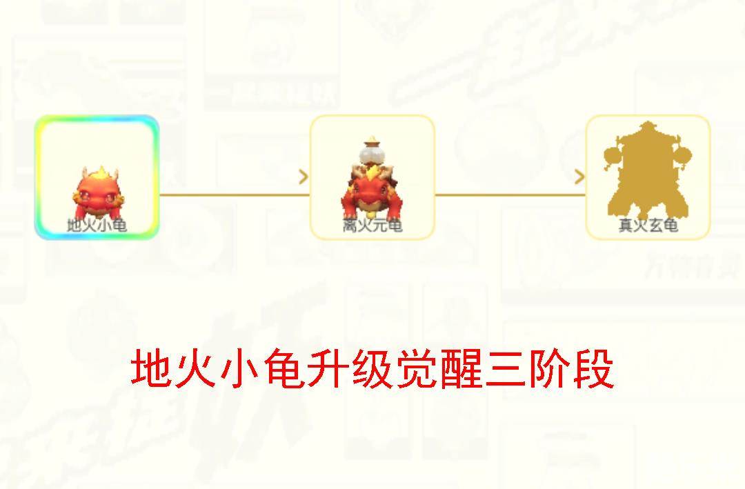 地火小龟是一个可以觉醒进化的妖灵,当它升级到10级时,就可以利用15个地火小龟的符印进行觉醒,觉醒之后就进化为离火元龟;当升级到30级,再利用符印觉醒进化为真火玄龟。