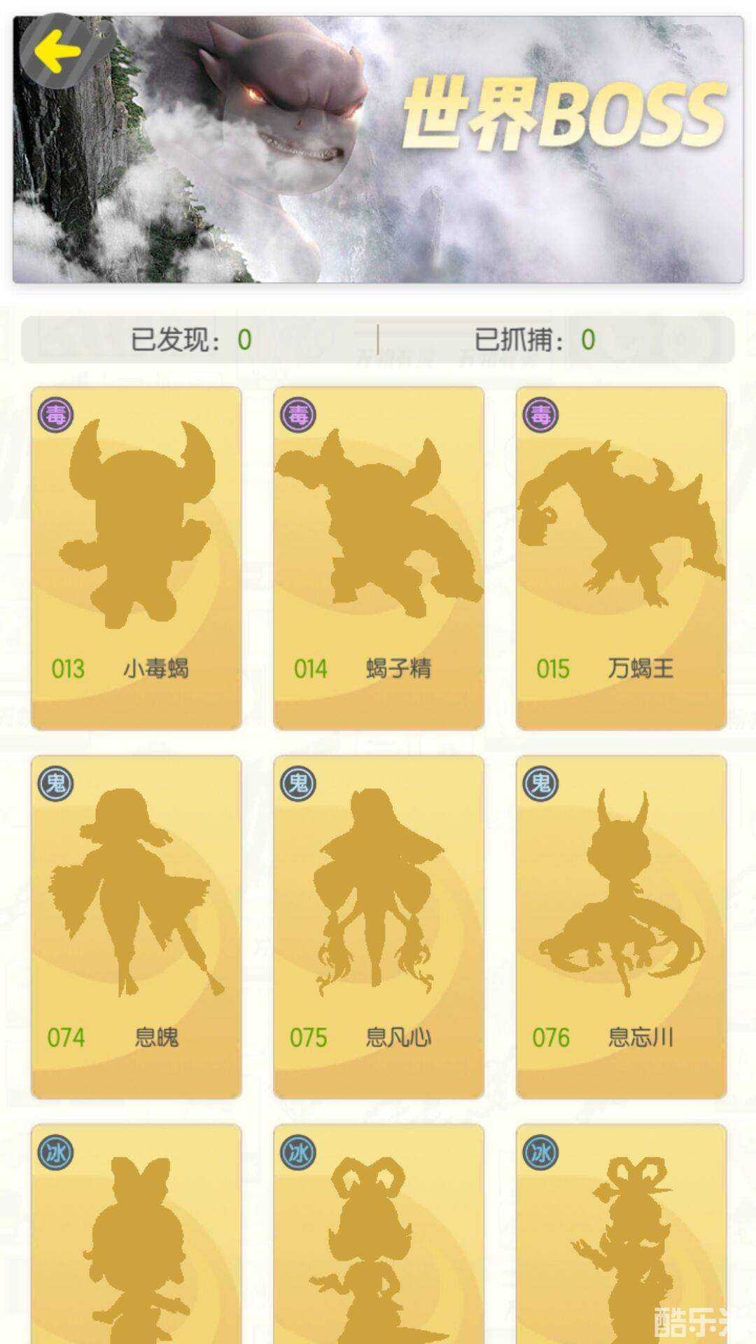 世界BOSS图集一共有10只妖灵,但是我们可以分为(万蝎王)(息忘川)(蛇娘娘)(捉妖记血妖)四类,因为(万蝎王)(息忘川)(蛇娘娘)是一个系列的觉醒妖灵,每一种有三个妖灵。