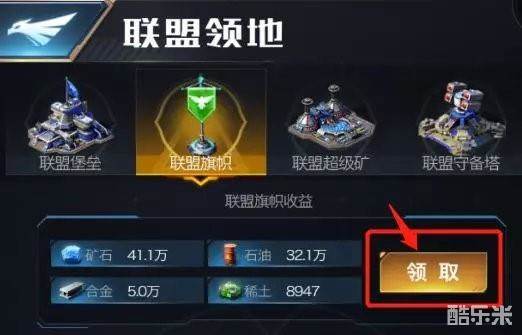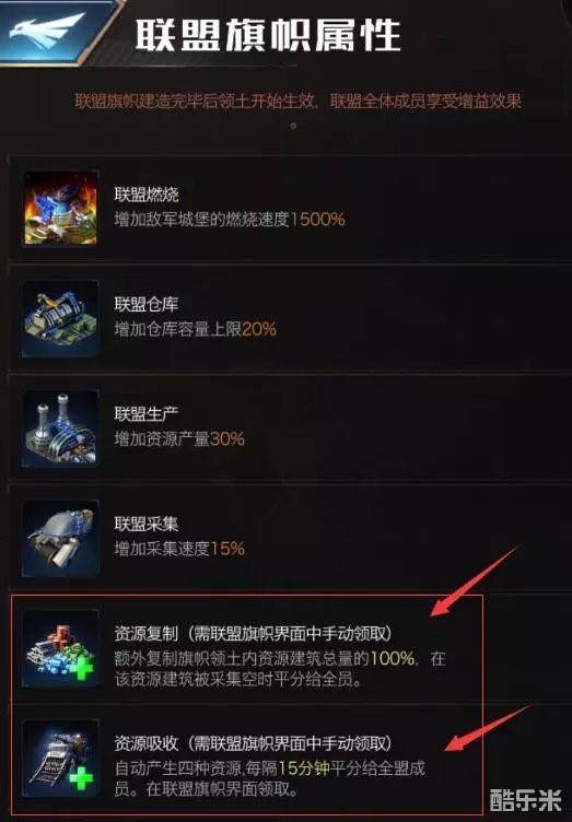 增益二:资源吸收,建造完成的联盟旗帜会自动产生四种资源,将每15分钟向旗帜归属联盟全员均分一次。(需要在联盟旗帜界面手动领取)