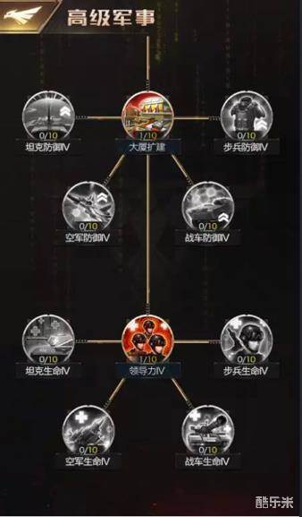 首先我们看下兵种属性加成,包括攻击、防御、生命。在军事科技中,每次升级会加1%的属性,但是在高级军事科技里面,每次升级都是增加2%的属性,比普通军事科技增加的属性翻倍,10级的话能够增加20%的兵种属性,是不是感觉很强力。包括领导力科技,此次领导力IV每级能够增加4000出征上限,满级10级的话能够增加40000出征上限,这样攻打其他指挥官的时候再也不用担心兵太多出征不了的问题了。