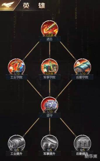 现在比较流行的喀秋莎+艾薇儿出征,我们一般携带的是防御坦克+突击步兵+狙击兵的出征配置,如果研究军事科技,必须要3个兵种的攻击加成都研究到10级才能达成所有兵种攻击提升10%的属性,但是在英雄科技里面,只要把进击这个科技研究满,就能达成。而且最主要的一点是,跟军事科技的加成会累加的。