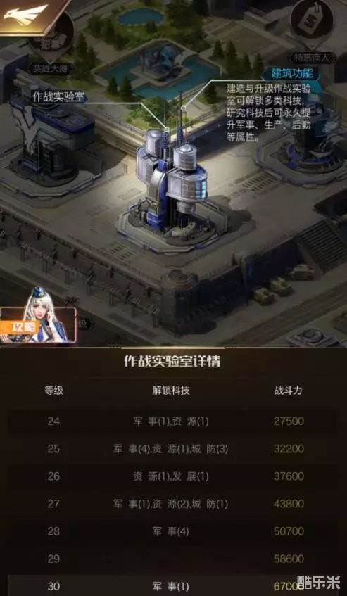 在游戏主城界面点击建筑工厂右下方的作战实验室,建造和升级作战实验室可以解锁多类的科技。