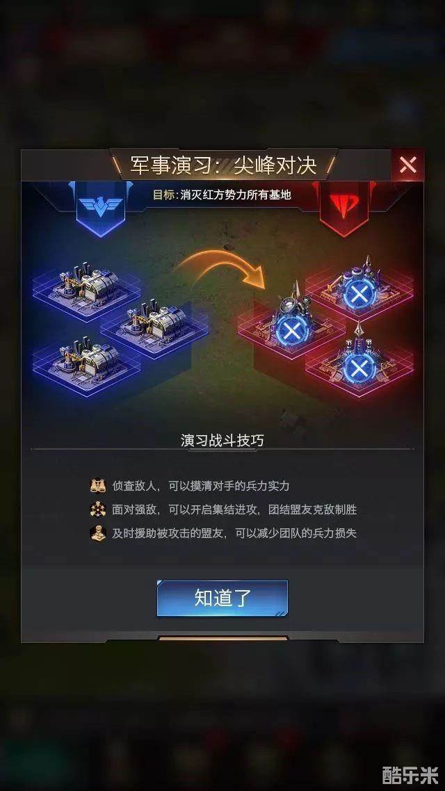 创建房间并与盟友组成3人队伍,进入副本战场进行3v3的军事演习。在规定时间内消灭演习副本中所有敌方部队即可取得胜利并获得演习奖励。随着基地等级提升,指挥官可以挑战越来越强的演习对手。