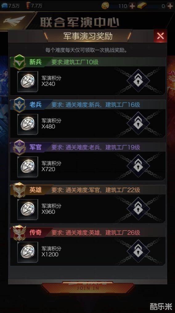 联合军演每周定期限时开放,每个难度奖励当日每个指挥官只能领取一次。要挑战高难度的演习,必须先通关前一难度的演习,同时指挥官的建筑工厂也需要达到对应的级别。