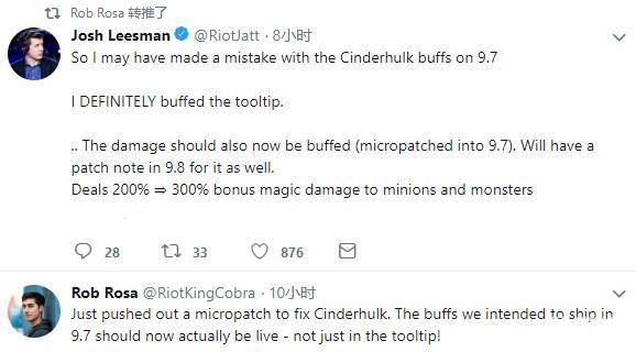前北美LCS联赛解说Riot Jatt,现在他担任游戏平衡团队的设计师,他也在个人推特上向广大玩家道歉,表示这个失误是自己造成的。他在测试服改动了熔渣巨人,但在正式服补丁推出时,忘记将这个改动内容加进去了。因此,Riot Jatt主动背锅道歉,他在今天上线了一个紧急修复补丁,让熔渣巨人可以对野怪和小兵造成更高的伤害。