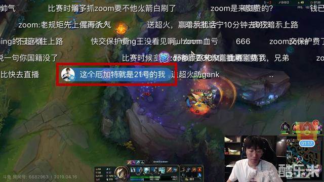 事情是这样的,这一局ning在玩人马打野,自己家上单是阿卡丽,对面上单是厄加特,在zoom来看ning直播的时候,ning刚好正在军训上路,抓死了对面上路厄加特。Zoom看到了之后也发出了感言:我慌了,这个厄加特就是21号的我。