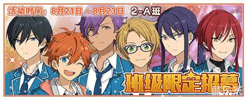 2-A班级限定招募活动正在进行中。10连招募必得5名及以上2-A班级偶像!Kirakira的明星昴流、严谨认真的冰鹰北斗、摘掉眼镜就是超级美男子的游木真、坚持武士道的神崎飒马、不厌其烦地劝你吃肉的阿多尼斯、神秘魔法使逆先夏目,6位风格迥异的爱豆,哪一个是你的菜,快和他来一场命中注定的邂逅吧~每1次招募可以获得一枚印花,同时可能获得3星、4星或5星偶像。前两次10连招募必出4星以上偶像哦~