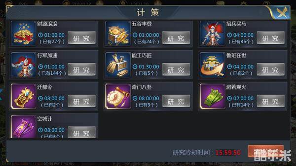 玩家可以通过在计策所之中进行研究来获取计策,而研究完计策之后研究所将进入一定的冷却时间,冷却时间可以通过花费元宝来清空从而使得玩家能够拥有更多计策可供使用。
