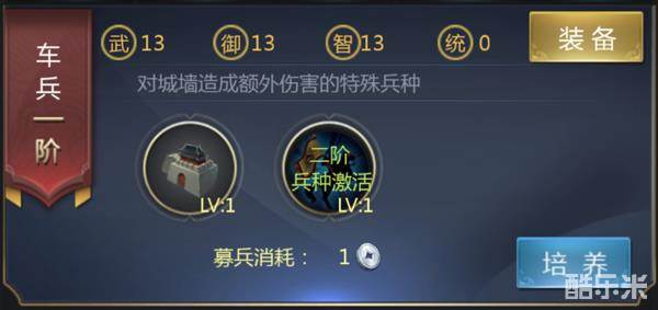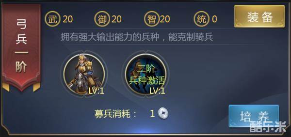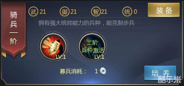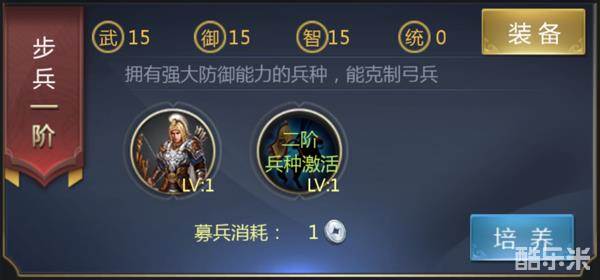 兵阶:共十阶,通过消耗金币和兵法书可进阶,激活属性,增强兵种战力