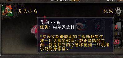 这个任务可以拿到一个战斗宠物“复仇小鸡”,虽然该宠物可以交易,但任务刷新频率很低,每4个月出现一次,所以不要错过这次机会。