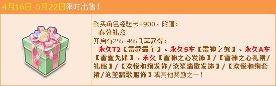 4月16日-5月22日购买角色经验卡+900,附赠:春分礼盒,开启有几率获得:永久T2【雷霆霸主】、永久S车【雷神之怒】、永久A车【雷霆先锋】、永久【雷神之心发饰】/【雷神之心礼裙/礼服】/【欢悦和绚发饰/沧笙踏歌发饰】/【欢悦和绚套裙/沧笙踏歌服饰】或其他奖励之一!获得核心奖励永久型概率是:2%-4%,获得核心奖励期限型概率是:4%-6%,获得非核心奖励概率是:90%-94%。
