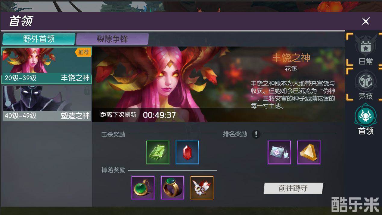 20级到39级的玩家,推荐参与击杀丰饶之神,40级到49级的玩家,推荐参与击杀塑造之神,Boss出现后,野外首领界面即会显示boss当前血量,记得在被击杀前,摸上一下boss哦。期间会按玩家对boss的输出量进行排名,努力获得排名,也能获得丰厚奖励。