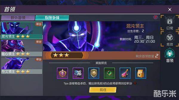 当玩家等级大于等于37级,且是公会的正式成员及以上阶级的话,在每周的周三、周日的晚上20:30~21:00,可以通过主界面活动->首领->裂隙争锋,参与激烈的裂隙争锋!活动开启后,共会开启3张地图,分别为混沌裂隙、噬心裂隙、符文裂隙。
