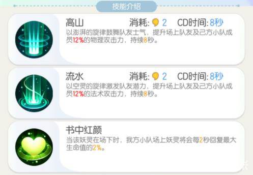 分析:这个被动技能完全能体现出颜如玉的强大辅助能力,只要在场下,就可以给上阵的妖灵回复血量,所以,御灵师在打出高山与流水技能后,需要快速转其他妖灵上阵,毕竟它比较脆肉。