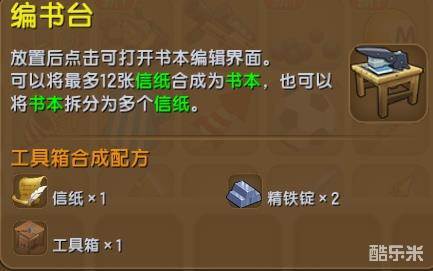 编书台需要1张信纸,1个工具箱,2个精铁锭使用工具箱合成制作而成。