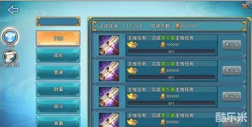 成就系统由九大部分构成,分别是任务、成长、登录、财富、战斗、装备、副本、PVP以及社交。