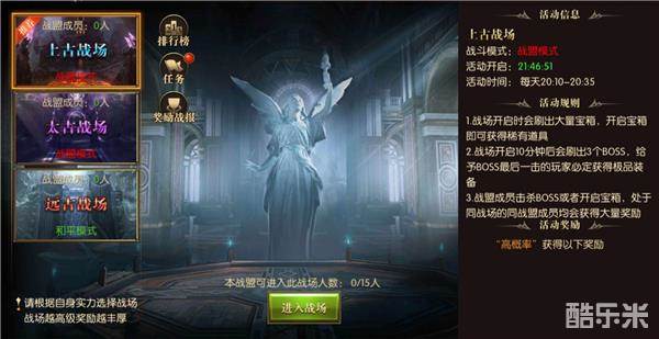 在三个战场中,除了远古战场采用和平模式外,另外俩个战场均采用战盟模式,同一战盟的玩家能够共享宝箱奖励。玩家要开启宝箱需要等待一段时间,在等待宝箱开启的时间内,玩家受到攻击会被打断,这个时候就得靠队友来保护了。这也就意味着,以战盟为单位的抢宝箱抢BOSS的PVP战斗将成为永恒战场的主旋律,只有与战盟成员在同一个战场中战斗才是最佳的选择。