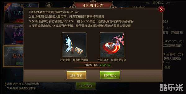 作为游戏里的限时玩法,永恒战场开启十分钟后会刷出3个BOSS,在开启时还会出现大量的宝箱。对BOSS造成最后一击的玩家就能够获得极品装备。而玩家拾取的宝箱分为青铜白银黄金钻石四个等级,越高级的宝箱开启后得到的奖励就越稀有。