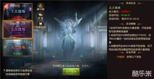 小编觉得游戏里的永恒战场这个玩法最有趣,这种玩法是其他游戏没有的。玩家在永恒战场里不仅是捡宝箱打boss,更是玩家之间的混战夺宝。这种热血的战斗场面想想就激动啊。永恒战场分为三个战场:上古战场、太古战场、远古战场。除了远古战场是和平模式之外,另外两个战场都是战盟模式。游戏中的竞技场的排名是永恒战场的准入条件,竞技场排名越高就能够进入更高级的永恒战场。永恒战场在开启后会刷出3个BOSS以及大量的宝箱,对BOSS造成最后一击的玩家可以获得极品装备。