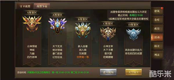 战盟争霸是以战盟为单位展开的多人限时PVP玩法,战力不同的战盟会根据整体战力被划分进不同的战区。夺得S级战区的冠军将获得霸主殿堂的奖励以及展示权利,大量奖励及属性加成在向你招手。在战盟争霸过程中同样能得到极品装备及道具奖励,奖励可以放入战盟拍卖行中供其他战盟成员购买。排名越靠前的战盟获得的奖励也会成倍增加哦。
