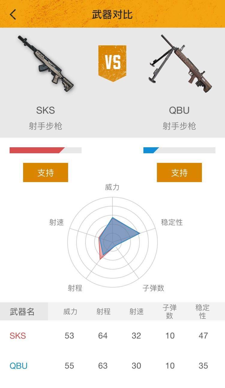 从基础属性上可以来看,QBU与SKS的各方面属性都相差不大,SKS唯一有优势的就是它的稳定性了。有意思的是,QBU的伤害属性比SKS还要高,之前MINI14一直因为伤害太低而不被玩家喜好,而QBU则完美的弥补了这个缺点。