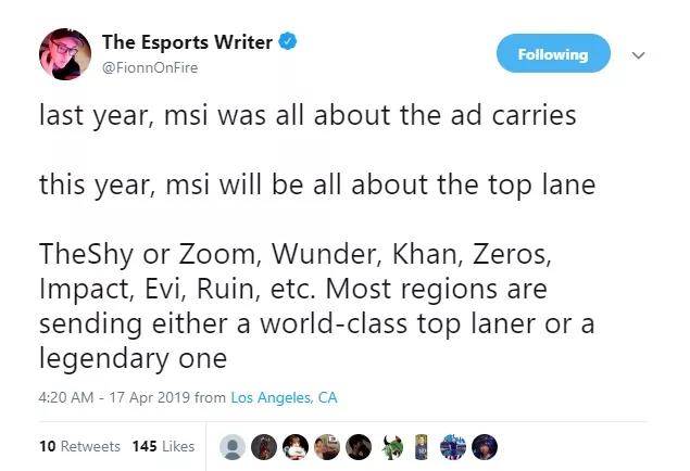 不过还是有好消息的,北美的著名解说Fionn表示去年MSI上是围绕下路的版本,所以UZI所在的RNG简直无敌,今年将会变成围绕上单展开的版本,而且今年每个赛区都有超强的上单选手,到时候这些世界级的上单选手碰撞在一起,应该是相当的好看了。不过这位解说一直都有着北美教练之称,所以结合我们赛区教练讲话的可信度,这位解说的话还是不值得确信的。