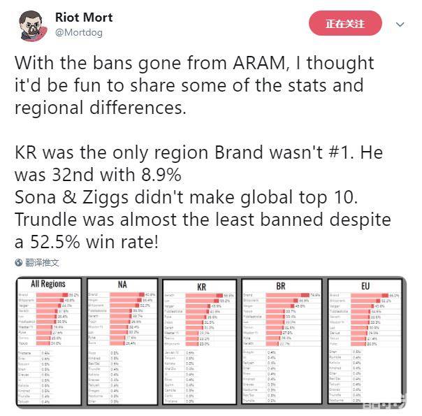 近日,拳头设计师Mortdog在Twitter上分享了大乱斗中的英雄Ban率,但其中并不包括国服,他还回答了一些网友的问题。