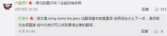 “英文是bring home the glory,这翻译基本就是直译,但用词也太土了一点,虽然英文也很直接 但中文绝对可以找到更信达雅的翻译”。