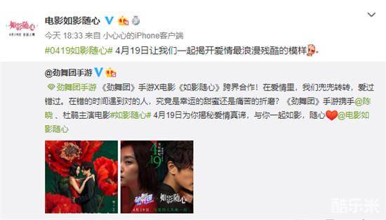 电影《如影随心》4月19日正式上映,此次跨界合作是手游在影视合作上的又一尝试。手游将不断尝试与高品质的品牌方合作,横跨影、视、歌等多元领域,致力于为玩家提供全方位、多层次、跨领域的新鲜游戏体验。更多精彩游戏资讯及福利活动,敬请关注手游官方微信号,参与互动更有豪华福利~《劲舞团》唯一正版手游现已正式全平台上线,苹果安卓同服畅玩,新奇活动等着你的参与~