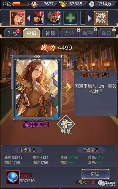 武将突破:当武将达到指定等级时可以队武将进行突破,武将突破能够极大提升武将战斗力,所以武将达到指定等级时千万记得进行武将突破哦~