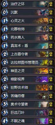 傻子牧依靠质量的傻子,配合沉默心火combo完成斩杀。相比于上面国服玩家的那套卡组使用寒光智者过牌,外服玩家选择了使用更为古老的北郡牧师与治疗之环的过牌combo,同时加入新卡药水商人让过牌更加容易。由于有狂野炎术师的存在,牧师往往可以配合小法术清光对面的小生物,甚至帮助苦痛侍僧过牌。达拉然图书管理员、奥数守望者和不眠之魂的加入进一步提高了傻子牧的可操作性,也让这套卡组更偏向于占场打输出,面对快攻甚至可以比拼场面。
