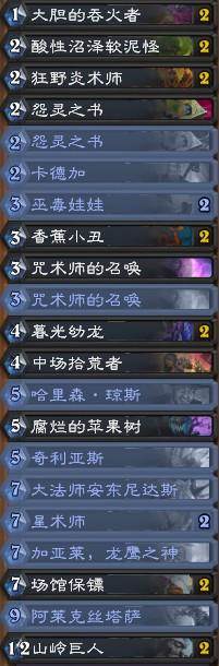 起手留牌方面,常规留牌找大胆的吞火者/炎术师/香蕉小丑,特别的后手怨灵之书山岭一起来可以留下,这样只要怨灵之书没有抽到法术即可3费山岭,以及面对超生德时场馆保镖也可考虑留下。