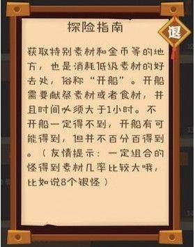 根据探险指南,需要献祭素材来增加开船探险的时间,时间必须大于1小时。当你有妖怪闲置在仓库的时候,就可以考虑来开船得到想要的金币、魂、素材。当然,开船都需要条件,只有当触发到了这个条件,才可以发动这艘船能得到的特定的东西。(简单来说就是:用不需要的素材和饭来换需要的素材或者金币。)