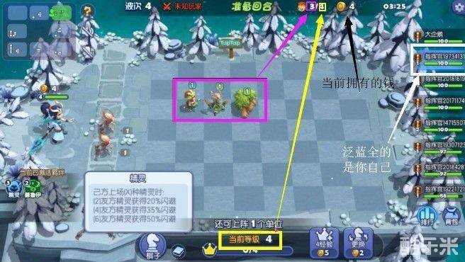 黄框框:可以理解为基地等级,目前4本基地,可以上场的卡牌上线为4。黄框框右边的是花费5个金币升基地,只有4点经验,注意使用!