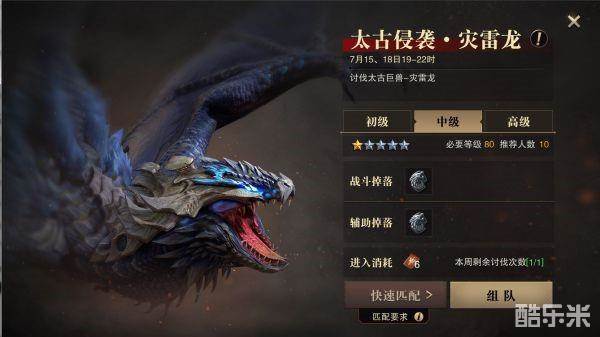 面对灾雷龙的强大力量,只有70级及以上的精英游骑兵才被允许加入本次太古巨兽讨伐的活动,而战斗中未知的危险和所消耗的巨大精力,也让亚夏不得不限制游骑兵们讨伐的时间和次数。灾雷龙讨伐将在7月15日和7月18日(本周日和下周三)晚19时至22时开放,在这两天游骑兵将各获得一次讨伐机会(讨伐成功才会消耗次数,失败不消耗),玩法具体规则如下: