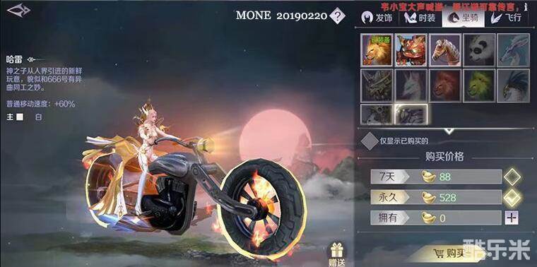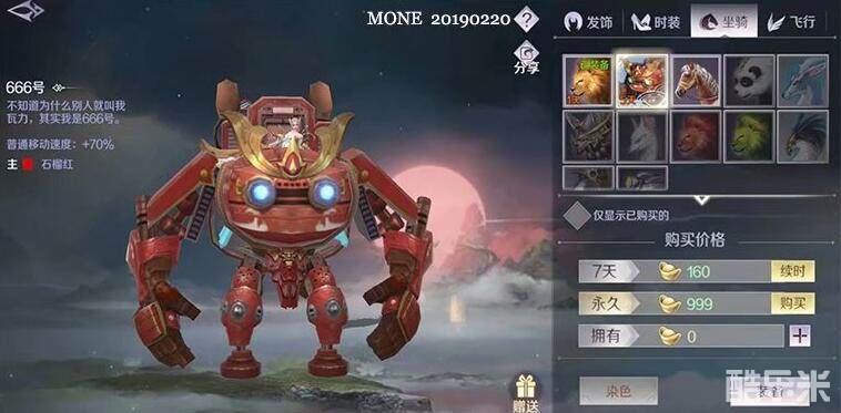 价格999元宝,可以提供70%移动速度,庞大的身躯看起来魁梧无比,特别适合娇小的女性角色;