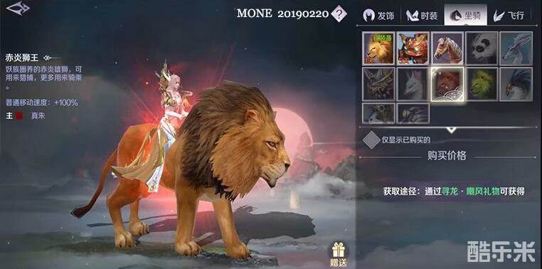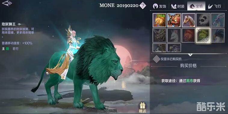 提供100%移动速度,价格1500元宝,威武霸气的狮子移动速度也不凡,王者气息;