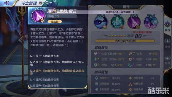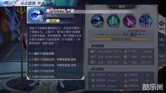 海潮(提升反伤率)、冰晶(提升效果命中)、雷云(提升最终伤害,类似法术强度)、海之意志(被动),序号1234,组合共10个技能。