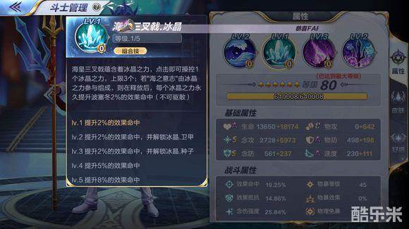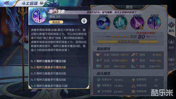 比如首次释放233组合技,释放技能后,满技能海皇提升8%效果命中,8%最终伤害。
