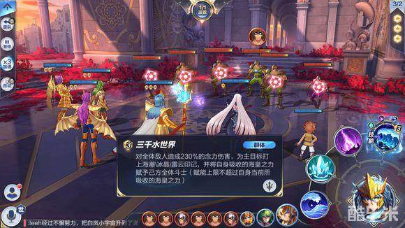 123组合技三千水世界,3费,群体230%念力伤害,并将身上的所有基础技能增益效果(反伤率、效果名称、最终伤害提升)赋予本方其他斗士。