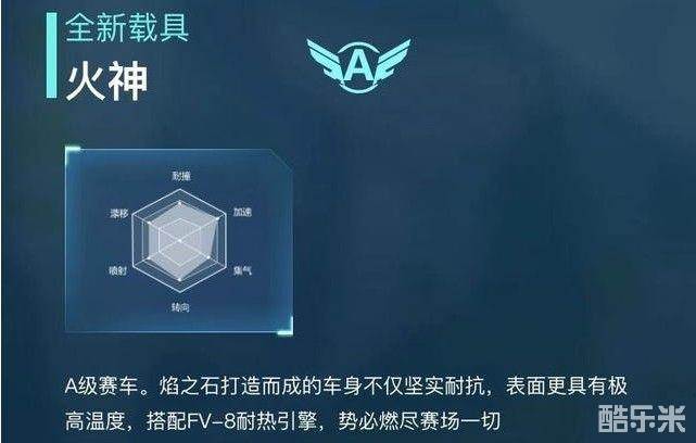 火神将在3月16日的时候上架正式服,全新元素属性车,A级赛车火神!六维属性在加速能力上非常突出,这里的加速能力有包含平跑加速、氮气加速这些,具体能突出到什么范围,还不知道!六维面积上,还是属于比较优秀的。