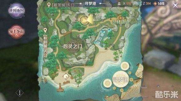 首先需要找到隐藏任务的坐标位置,这样才能前去寻找目标,完成相应的任务要求。神坛护卫隐藏任务需要去寻梦港完成,具体的坐标分别是:X178 Y321 Z314,下面有地图的平面详解,大家可以看一下,这些坐标的位置还是很好分辨的。
