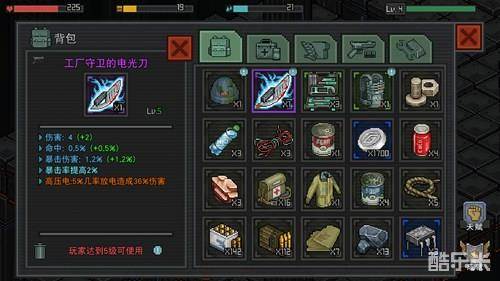 消灭第一章僵尸机甲BOSS后,除了会爆出一些食物、材料和弹药之外,还会掉了一些武器装备,小编就获得了它的攻击武器紫色装备电光刀。这把电光刀除了增加伤害、命中率、暴击等,还增加了特殊技能高压电攻击,每一次攻击都有5%的几率释放高压电对敌人造成36%的伤害,非常强大的近战装备哦。