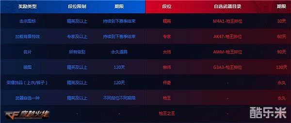 枪王排位在客户端更新后已经开启全新的第11赛季,各位CFer们可以根据结算获得相应段位奖励。精英及以上段位的玩家可获得击杀图标、加载背景特效、喷图、荣耀饰品(上衣/裤子)、自选武器等,所有级别玩家都可获得永久名片一张。此外,各段位玩家还可获得段位专属武器奖励。